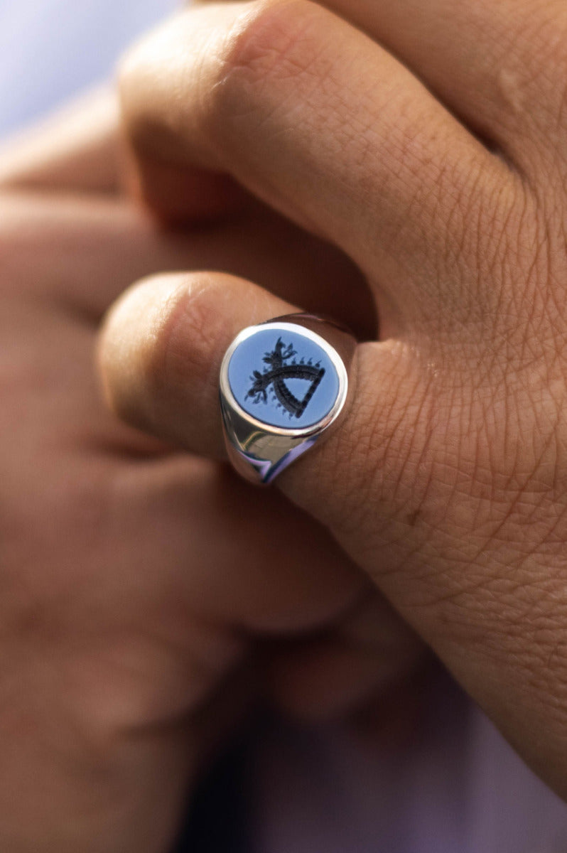 Verrijk je stijl met een steengravure in diepblauwe lagesteen, waarin we een wapenschild of monogram tot leven brengen. Een uniek en persoonlijk accent voor een tijdloos sieraad.