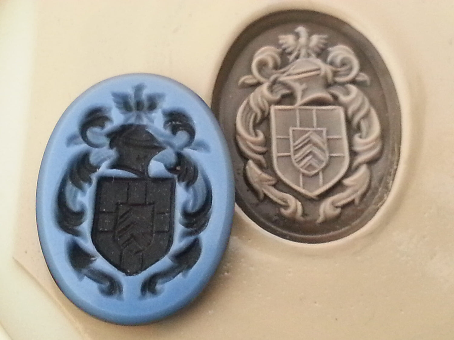 Een diepblauwe lagensteen, met het familiewapen gegraveerd, onthult symbolen van familiegeschiedenis. De lakafdruk toont het wapen in spiegelbeeld voor een correcte afdruk, zoals op de foto te zien is.